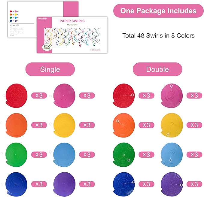 - ❤️ Multi-Colored and Double-Sided Design: This 48-piece Paper Swirl Decoration Set features bold, vibrant colors with double-sided prints, bringing energy and festivity to your events. With eight striking colors in both single and double spiral designs, these decorations transform your space into a lively and dynamic party setting.