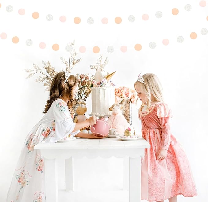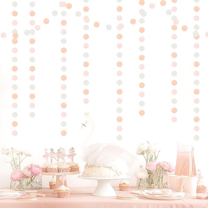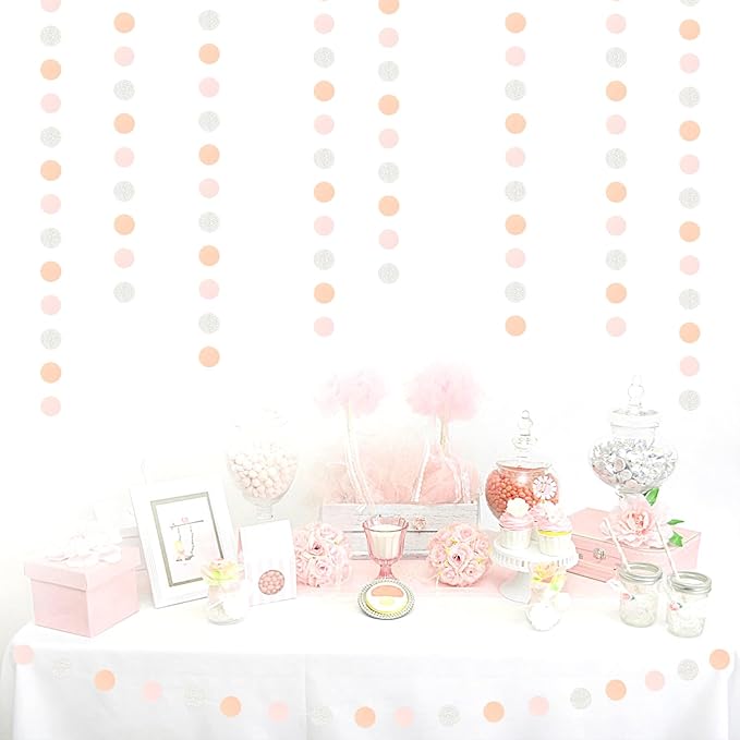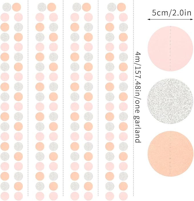 - PACKAGE CONTAINS: This set has four pink silver peach paper circle garland,the length of each strand is 4 meters/13.1 feet, the total length is 16 meters/52.5 feet.The size is 2IN.