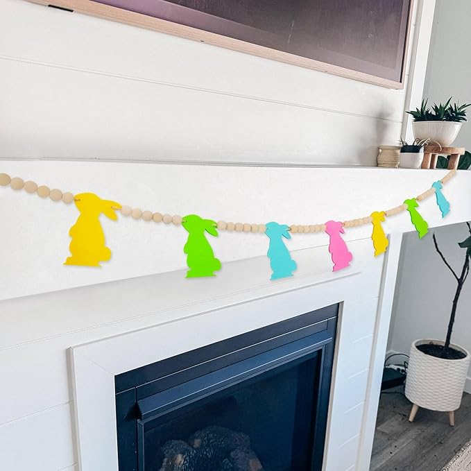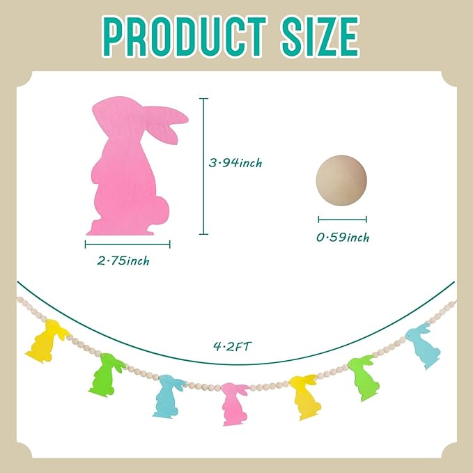 - [Dimensions]: The total length of this wood bead garland is 4.2 ft / 52 inches, with a total of 48 beads. The bunnys are 2.75*3.94 inch.