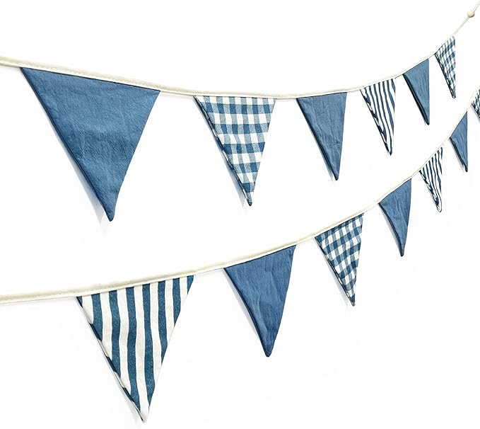 - Package Including:2 pack double layer linen fabric banner garland in blue, blue gingham and blue striped colors, 12pcs flags in 8.2ft/2.5meters each, total is 5M/16.4Feet. Flag side length: 6.3in.Each string has two small wooden beads strung at the end.