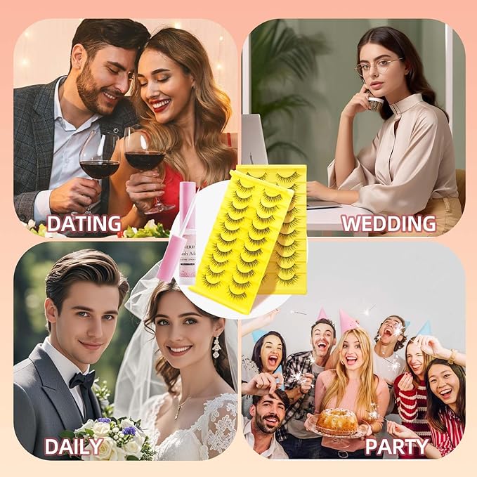 - All-in-1 Strip Lashes Kit:Our strip eyelashes kit includes everything you need to achieve stunning eyelashes. It includes: 10 pairs false eyelashes, 5ml strip lash glue. Purchasing a kit is often more cost-effective compared to buying strip lashes products separately. And this kit is so convenient to use at home or travel, brings you salon quality while saving time and money.
