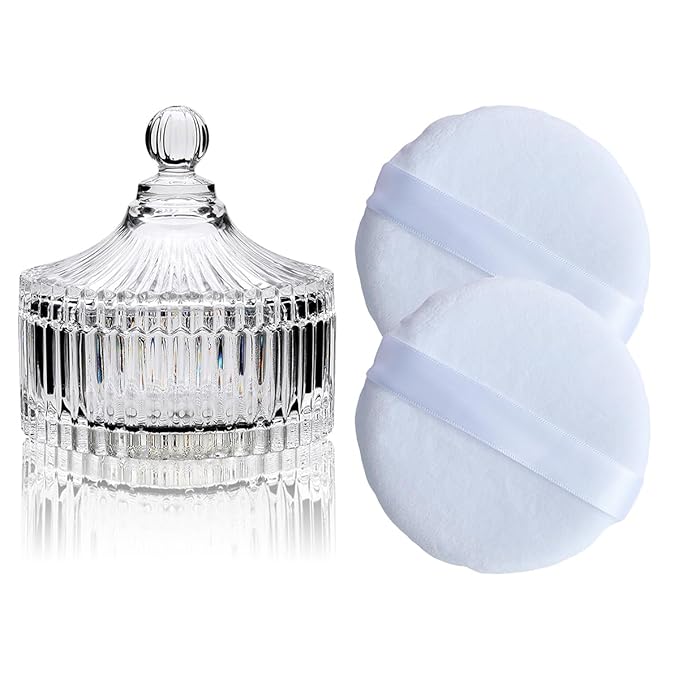 - Premium Combo Set:Includes 2 Crystal-Soft 5.12'' Body Powder Puffs + 1 Luxurious 5.3'' Glass Jar (non-sealing) for elegant storage and effortless application of body powder, makeup setting, highlighting facial contours or taming oily roots.