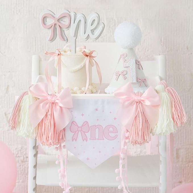 - PACKING LIST:This set includes one pink bow high chair banner:one handmade bow birthday hat;one bow cake topper