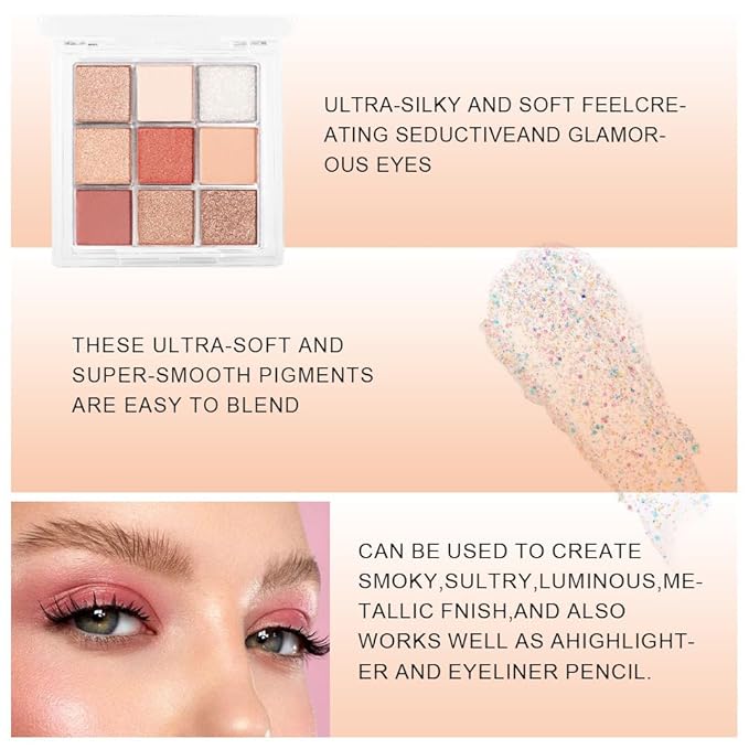 - 1. ✨ 9 Gorgeous Shades in One Eyeshadow Kit This 9-color eyeshadow palette includes a perfect mix of Golden-brown glitter, Light beige matte, Light blue-green glitter, and Peach matte, making it an essential natural eyeshadow palette for everyday glam or bold statement looks.