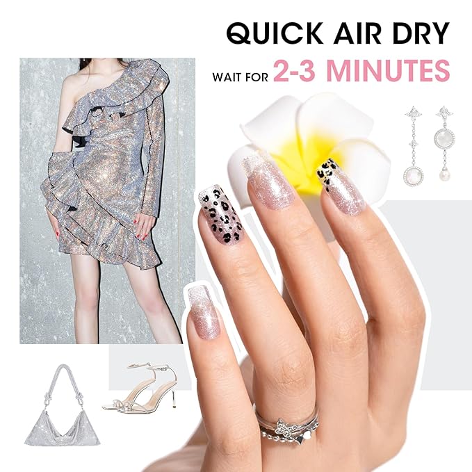 - Easy to Apply: 1, CIean and dry the nail surface. 2, Apply base coat and air dry for 2-3 minutes. TIPS: If humid or cold, air dry for 3-5min, if hot, air dry for 1-2min. 3, Apply first layer color and air dry for 2-3 minutes. Keep thin for first color layer. 4, Apply second color layer, air dry for 2-3 minutes. 5, Apply top coat and air dry for 2-3 minutes. 6, HOW TO REMOVE: Cover the nail surface with a nail remover pad for 5-10s and then wipe off.