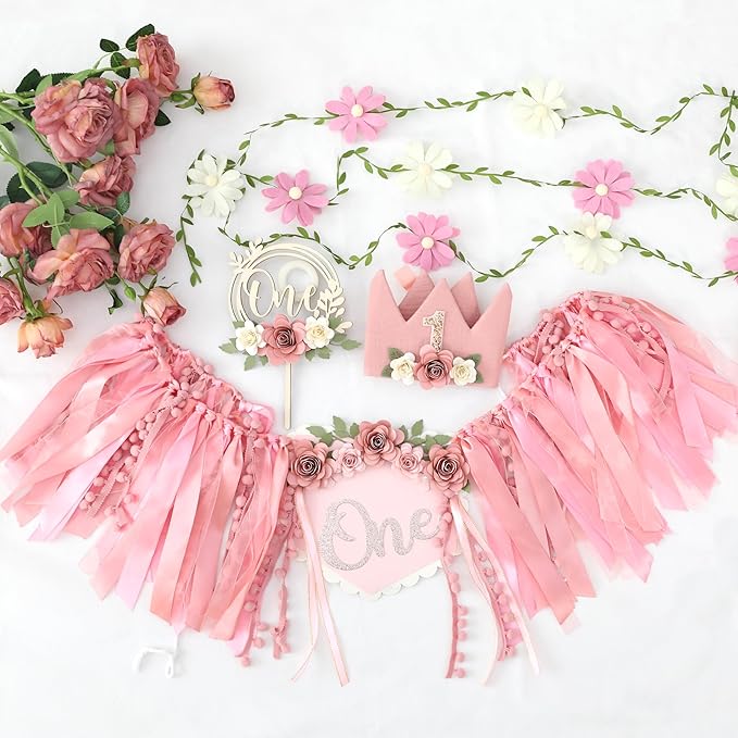 - PACKING LIST:This set includes one flower high chair banner:one handmade flower birthday hat;one wooden flower cake topper;one flower garland banner