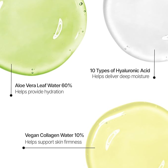 - 10 TYPES OF HYALURONIC ACID: Multi-layered hydration with low to high molecular weight hyaluronic acids for long-lasting moisture and improved skin elasticity.