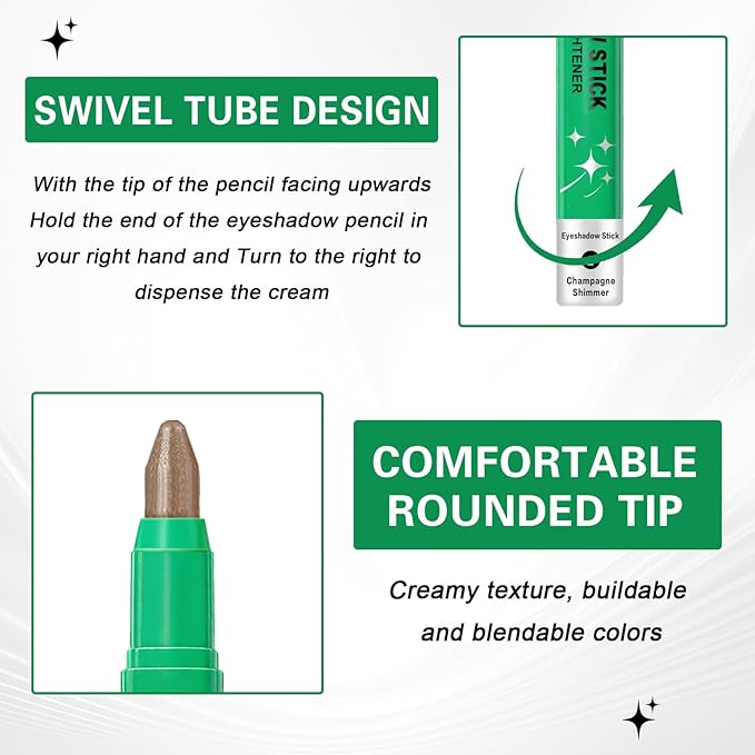 - 【Multi-purpose】Use as an eyeshadow pencil to add charming luster to the eyes and create a glamorous eyeshadow makeup;use as an eyeliner to shape a clear eye contour;use as a highlighter to bring soft brilliance to the bridge of the nose,inner corners of the eyes, forehead,etc.