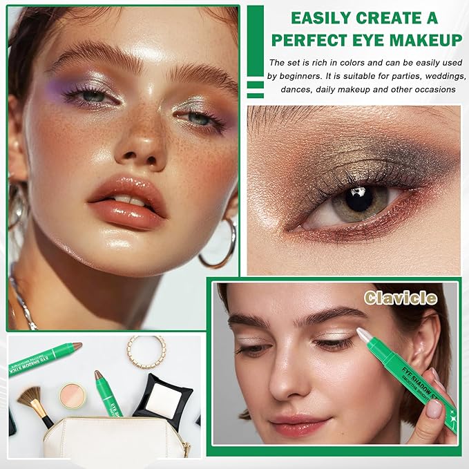 - 【Eye Shadow Sticks】8-color eye shadow sticks include 6 shimmering shades of Champagne,Pearl,Taupe,Bronze,Cocoa,Smoky Amethyst and 2 matte shades of Stone and Putty to meet your eye makeup needs