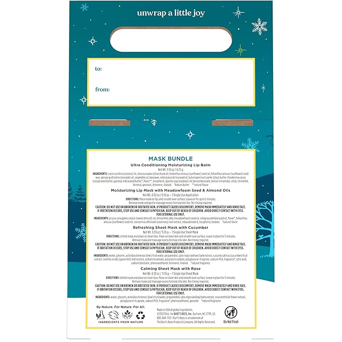 - GREAT CHRISTMAS GIFTS: One Burt's Bees Mask Bundle Gift Set that includes one Refreshing Face Sheet Mask, one Calming Sheet Mask, one Moisturizing Lip Mask and one tube of Ultra Conditioning Lip Balm