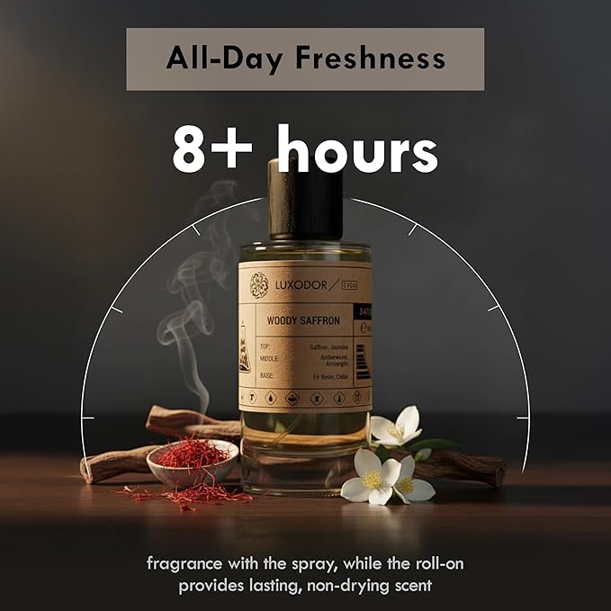 Woody Saffron Perfume for Men & Women, Inspired by MFK Bacarat Rouge 540, 2-Piece Combo of 100 ml Fragrance Spray Bottle and 10 ml Alcohol-Free Roll-On Perfume Oil, Vegan, Paraben-Free, Unisex