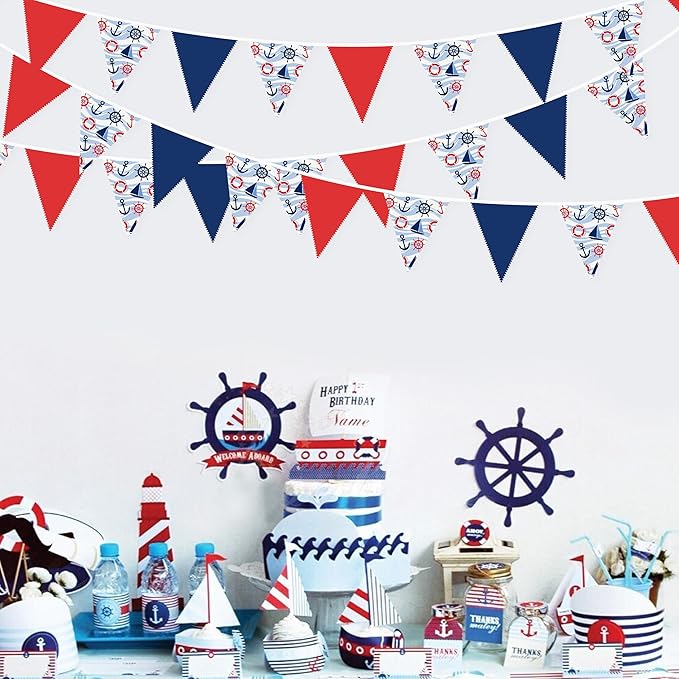 - 【Nautical Party Supplies】 These red blue white nautical bunting banner triangle flags great for any kind of celebration, party, festival, events or other occasion. Like baby boy birthday parties, nautical theme party, nautical baby shower, ocean theme party, boy baby shower, baptism,family gatherings,outdoor activities,picnic,BBQ,ahoy achor, sea party,royal blue party, red blue white party, hen party, bachelorette, christmas, wedding, bridal shower, anniversary, holiday, nursery, home decor etc.