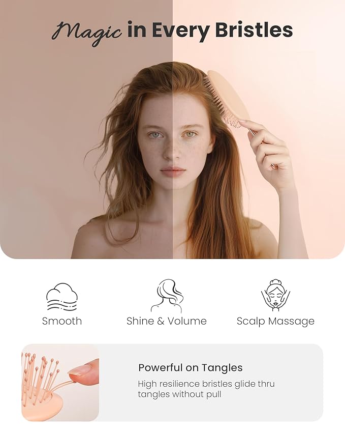 - Air Cushion Paddle Brush - Ball-tipped hair brush with soft and flexible rubber cushion will better for scalp massage and pressure relieve thus promoting blood circulation. When hair is dry, hairbrush’s nylon bristles evenly spread hair natural oils for shine and volume