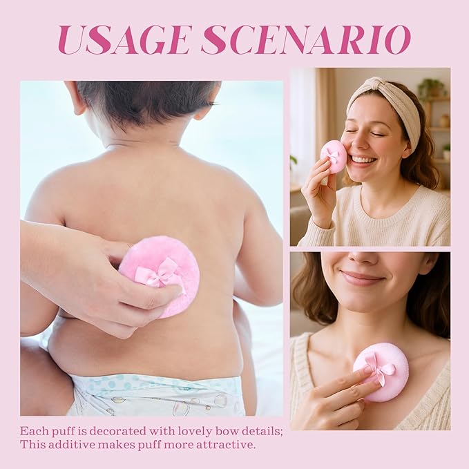 - Skin-Friendly & Versatile: The powder puff set is suitable for all skin types, including oily, dry, and combination skin, these puffs work flawlessly with loose powder, body powder, or shading powder. The added cute bow detail on each puff makes them both functional and charming.