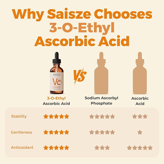 - EVEN SKIN TONE: SAISZE Vitamin C Serum for face with 3-O-Ethyl Ascorbic Acid helps improve the appearance of dark spots, sun spots, and uneven tone for more luminous complexion. It works gently as a dark spot remover for face, helping refine overall clarity without harsh ingredients