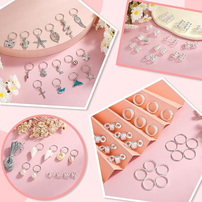 - Complete 285PCS Hair Jewelry Set – This set includes 285PCS silver hair jewelry for braids in 37 unique styles, giving you endless options to style braids, locs, and dreadlocks. Perfect for both women and men, these silver hair accessories combine elegance and versatility. From silver hair charms to hair cuffs for braids, each piece adds a unique touch to your hairstyle for daily wear or special events