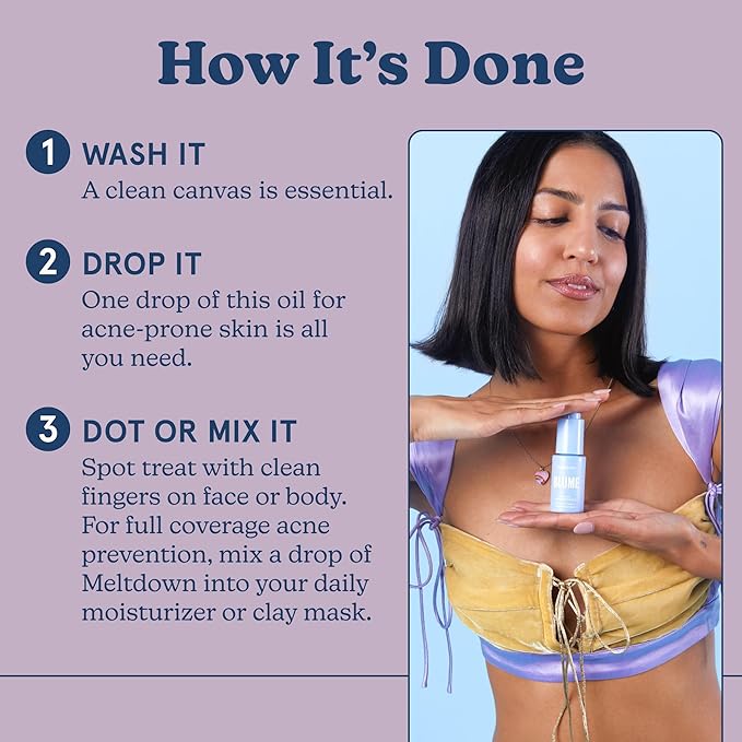 - A Revelation In Skincare - Meltdown is an award-winning facial oil designed for acne-prone skin, made from a powerful blend of clean ingredients to clear skin, without compromising hydration. This natural acne treatment helps to calm redness, minimize pores and prevent future breakouts. Always hydrating and never drying.