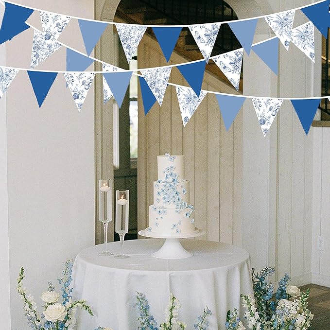 - Blue Floral Party Choice: These navy and white porcelain triangle flags are good ideal for any kind of celebration, party, festival, events or other occasion. It can be used by both kids and adults. Like floral party, camp bachelorette, flower party, tea party, dinner celebrations, spring parties, summer party, wedding, banquets, birthday, baby shower, nursery christening, family gatherings, outdoor activities, picnics etc.