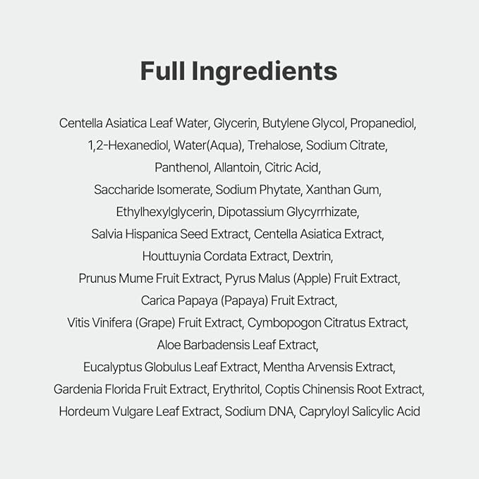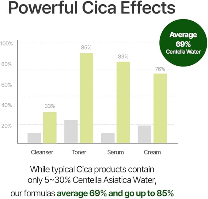 - 85% Centella Asiatica Leaf Water : Packed with skin-calming cica (centella asiatica) sprout extract to gently exfoliate, tone, and soothe sensitive or troubled skin