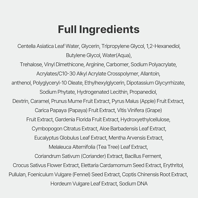 - 83% Centella Asiatica Leaf Water : Packed with skin-calming cica (centella asiatica) sprout extract to gently exfoliate, tone, and soothe sensitive or troubled skin