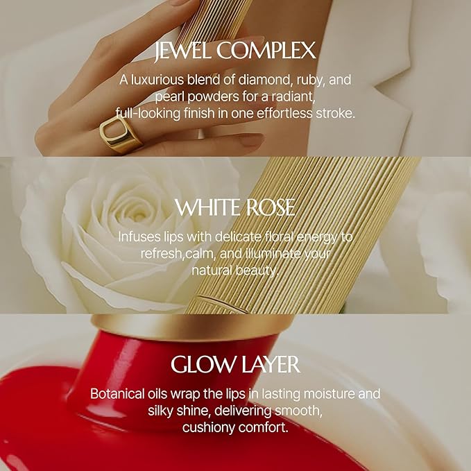 - [White Rose & Natural Oil Glow-Coating Layer] Comforting oils form a thin, flexible glossy veil that helps keep lips feeling soft and moisturized.