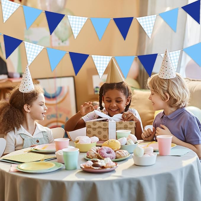 33 Ft Hanging Banner Decoration Triangle Flag Blue Pennant Plaid Fabric Bunting Garland for Birthday Wedding Baby Shower Party Supplies