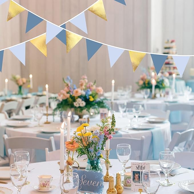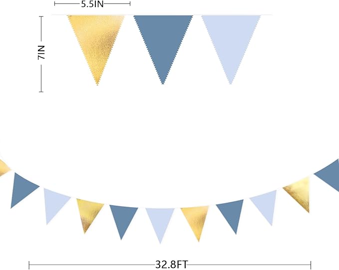 - Package Including:1 pack dusty blue gold fabric bunting banner garland in metallic gold, dusty blue and light blue colors, with 36pcs flags in 10M/32.8Feet. Flag Size: 5.5in width x 7in height