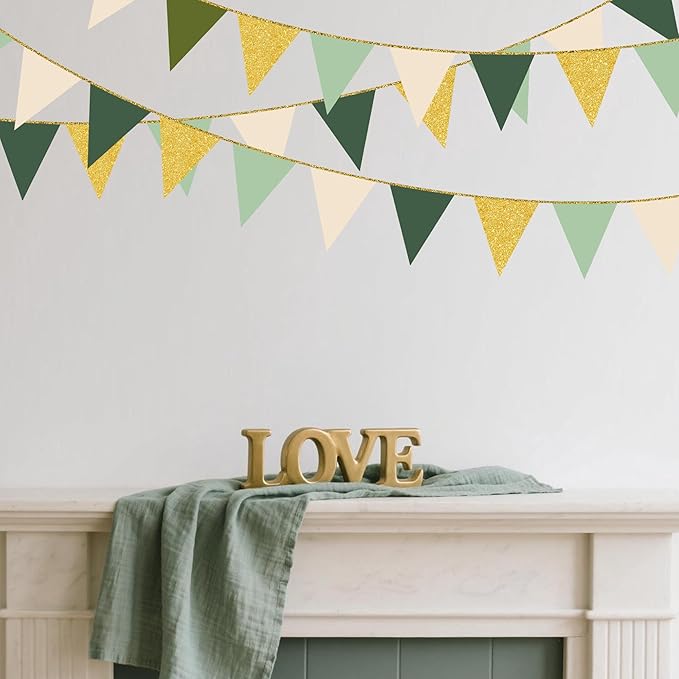 - Material and Handmade - Our sage green gold triangle flag are made of quality cardstock and glitter paper, carefully hand-made and machine-sewn together with gold glitter ribbon,durable and reusable.