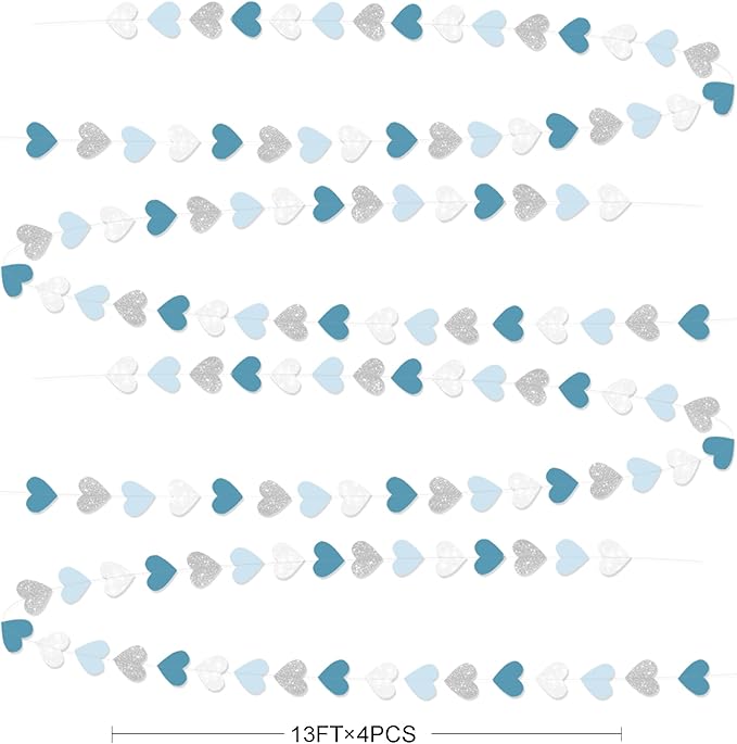 - Package Contains - 4 packs of dusty blue glitter silver white heart party decoration garland,Each string is 13 feet/ 4 meters.Total 16 meters/52 feet.